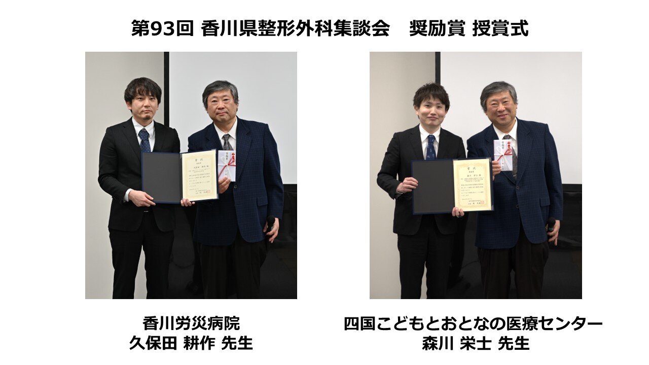 四国こどもとおとなの医療センター 森川 栄士 先生による『受傷前の骨粗鬆症薬投与の有無が大腿骨転子部骨折の骨折型に及ぼす影響~中野分類を用いた3DCT解析~』に授与されました。