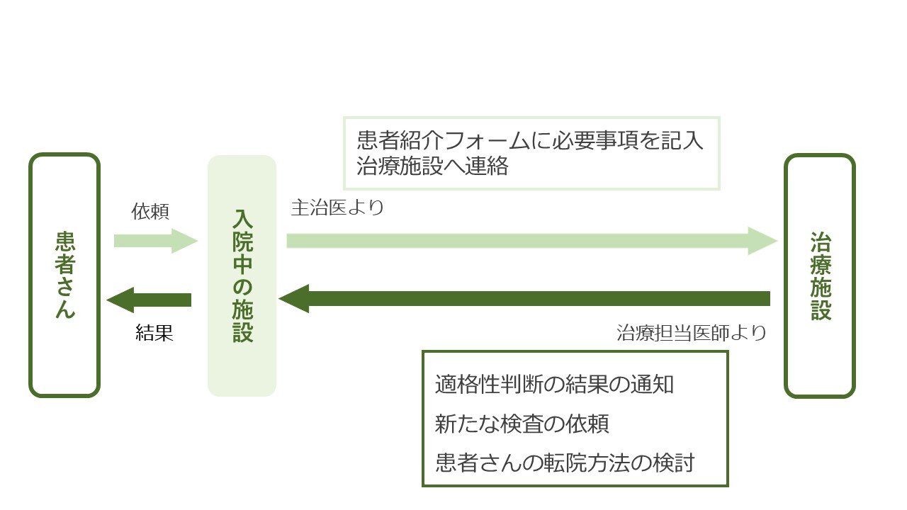必ず、入院中の医療機関の主治医に当院への紹介のご依頼くださいますよう、よろしくお願いいたします。